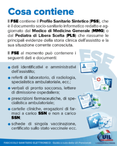Il FSE contiene il Profilo Sanitario Sintetico (PSS), che è il documento socio-sanitario informatico redatto e aggiornato dal Medico di Medicina Generale (MMG) o dal Pediatra di Libera Scelta (PLS) che riassume le principali evidenze della storia clinica dell’assistito e la sua situazione corrente conosciuta.