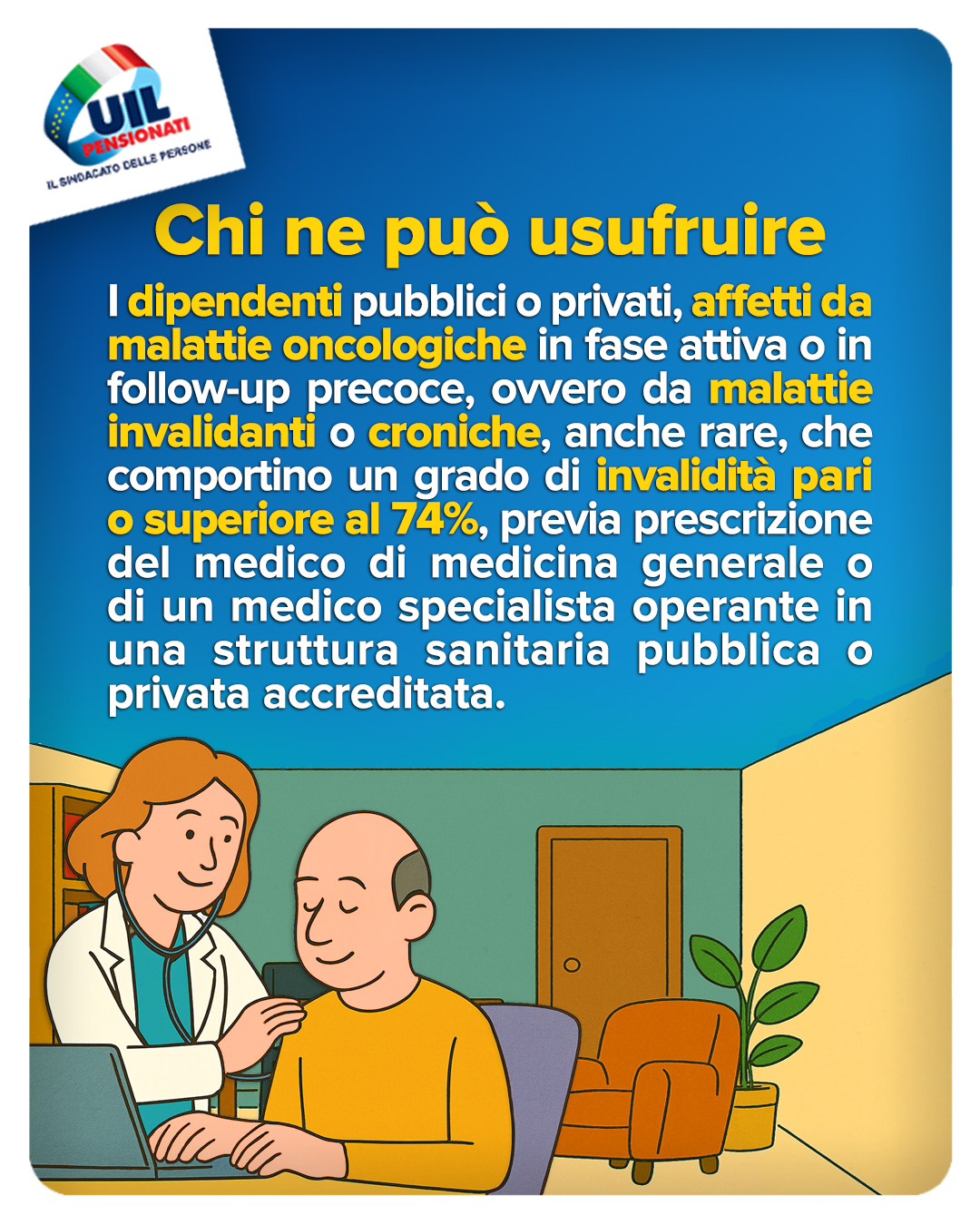 I dipendenti pubblici o privati, affetti da malattie oncologiche in fase attiva o in follow-up precoce, ovvero da malattie invalidanti o croniche, anche rare, che comportino un grado di invalidità pari o superiore al 74%. Previa prescrizione del medico di medicina generale o di un medico specialista operante in una struttura sanitaria pubblica o privata accreditata.