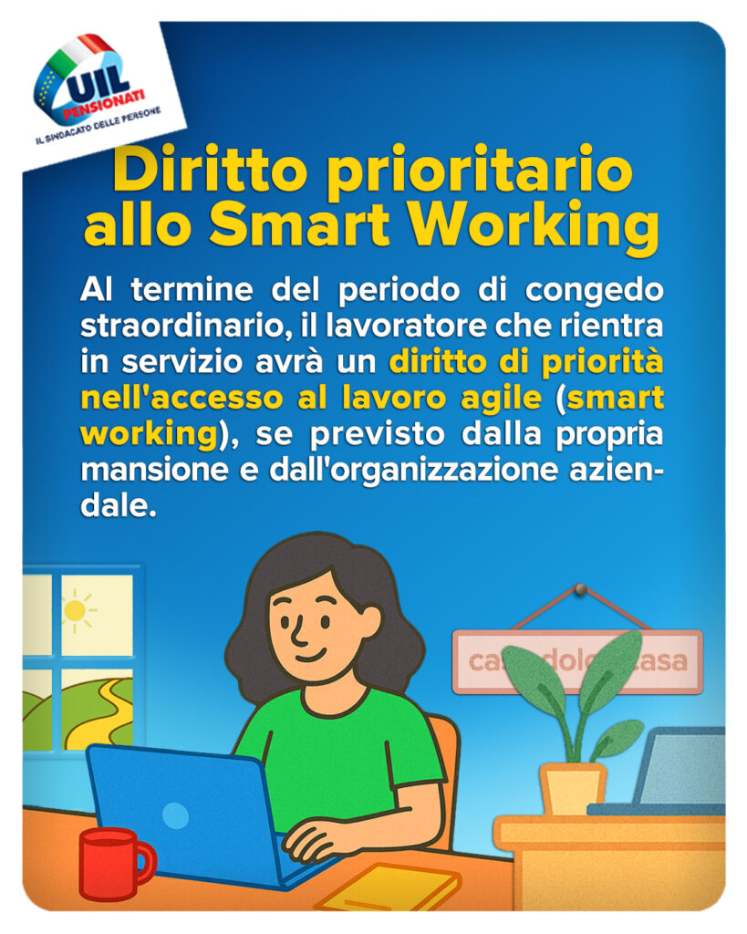 Al termine del periodo di congedo straordinario, il lavoratore che rientra in servizio avrà un diritto di priorità nell’accesso al lavoro agile (smart working), se previsto dalla propria mansione e dall’organizzazione aziendale.