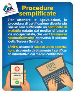 Per ottenere le agevolazioni, la procedura di certificazione diventa più snella: sarà sufficiente un certificato di malattia redatto dal medico di base o da uno specialista, che verrà trasmesso telematicamente attraverso il sistema della Tessera Sanitaria.